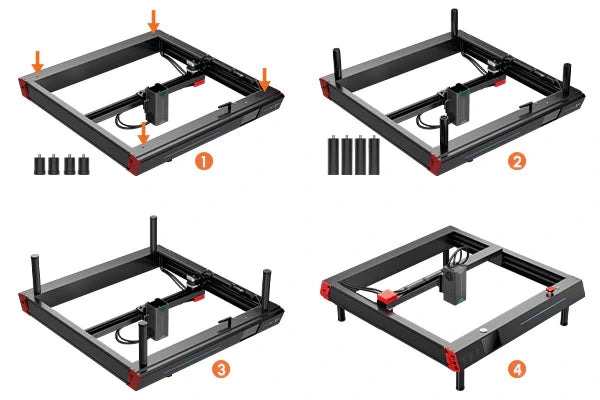 Delta & DIY KIT Installation 1. Remove the original support feet. 2. Install the universal risers. 3. Affix the original Support Feet to the underside of the Universal Raisers. 4. Turn the machine over and finish the installation Alpha Installation Turn the machine over and tighten the screws. Installation is complete.